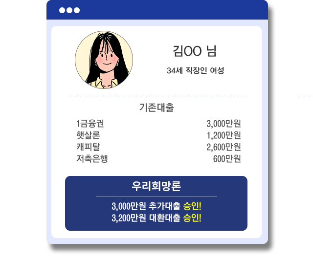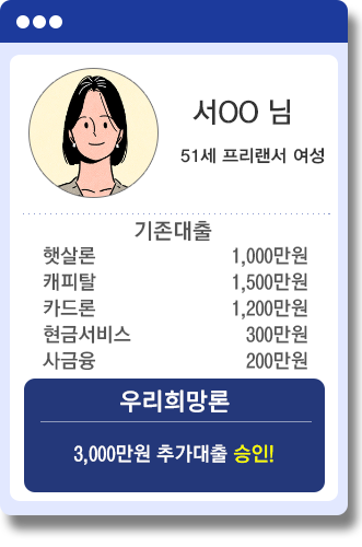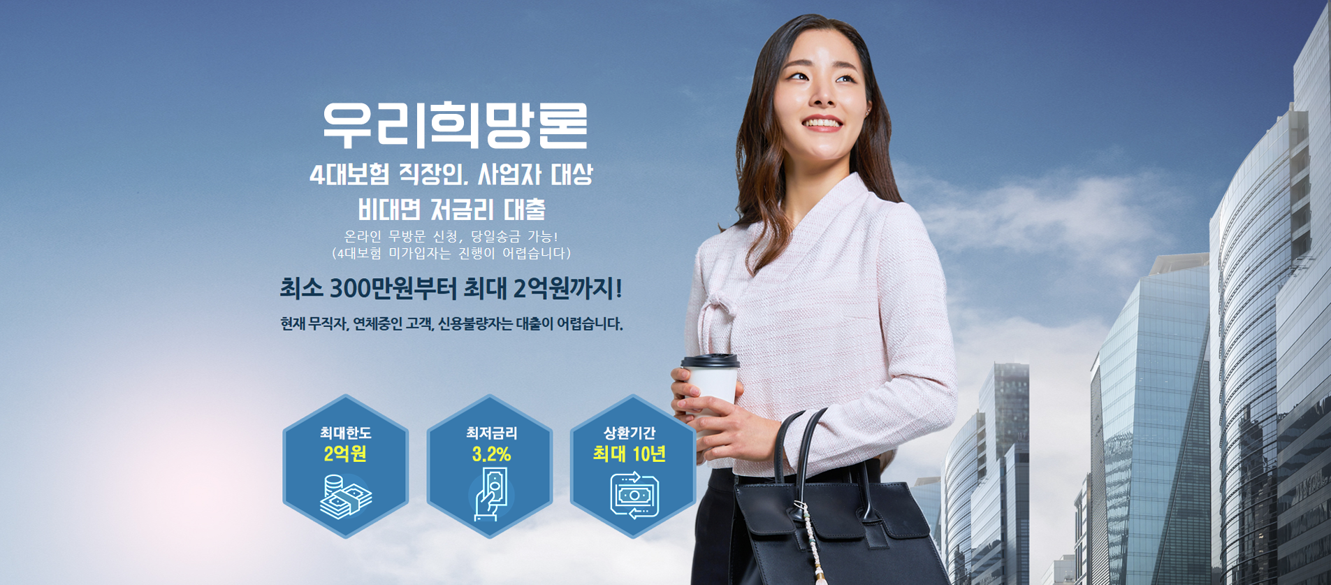 만 20세이상 고객 대상으로 개인신용평점 등 신용도 및 당사 평가기준에 따라 대출 가능 여부 및 이자율 산출. 단 채무불이행 등록자는 제외 |이자는 매월 약정일에 부과하고, 상품에 따라 원금자유상환(만기일시상환), 원리금균등분할상환 등의 방법으로 상환|연체금리 : 약정이자율+3%P이내, 연20%이내.