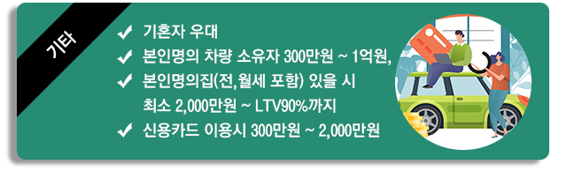 | 유의사항 | 계약 체결 전 상품설명서 및 약관을 확인하시기 바랍니다. 해당 상품에 대해 충분한 사전 설명을 받을 권리가 있으며, 설명을 이해한 후 거래하시기 바랍니다. 과도한 대출은 개인신용평점 하락의 원인이 될 수 있습니다. 개인신용평점 하락으로 금융거래의 제약 또는 불이익이 발생할 수 있습니다. 연체 시 계약기한 만료 전 원리금 변제 의무가 발생할 수 있습니다. 기준금리 변동에 따라 대출금리가 변경 될 수 있습니다. 신용점수 또는 금융사 대출규정에 의거 결격사유가 있는 경우 대출이 제한됩니다. 대출금 상환 지연시 예금등 기타채권과의 상계나 법적절차진행 등으로 재산상의 불이익을 받을 수 있습니다. |
